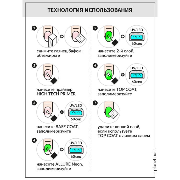 Гель-лаки линии Neon используются с базой и топом Prestige, имеют стойкость покрытия до 21 дня.
